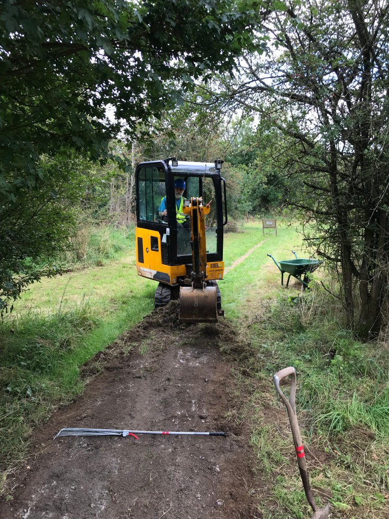 St Mary’s Fields Conservation – If you’d gone down to the wood today – or, more accurately, at the beginning of September – you’re sure to have had a surprise. A digger was out chortling gently amongst the trees as part of the effort to clear paths – an early autumnal task for the St Mary’s Fields’ work party. The other (humanoid) volunteers made themselves busy with clearing back encroaching foliage, wood-chipping paths, and checking on how the slow worm hideouts are going.