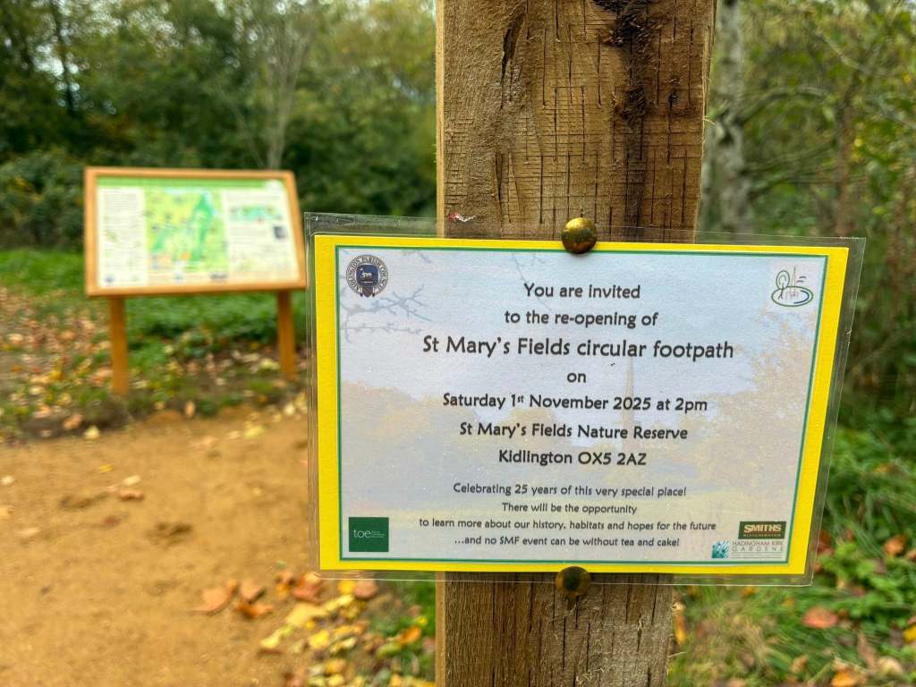 In case you missed it, or have not yet sampled it, the circular path from one end of the St Mary’s Fields car park down to the pond and back round to the gate was resurfaced last term with a grand opening on the 1st Nov. St Mary’s Fields Nature Reserve worked with The Genuine Disabled Access Taskforce to make it fully accessible and thus enable more people in our community the opportunity to enjoy this lovely local natural resource and beauty spot. The new path is 1.2 metres wide and includes periodic passing places and improved drainage. The £42K that the improvements cost were made possible by a TOE grant, as well as generous contributions from the Parish Council, Smiths of Bletchington, and the contractor Handingham Kirk who gave an ecology/community discount.