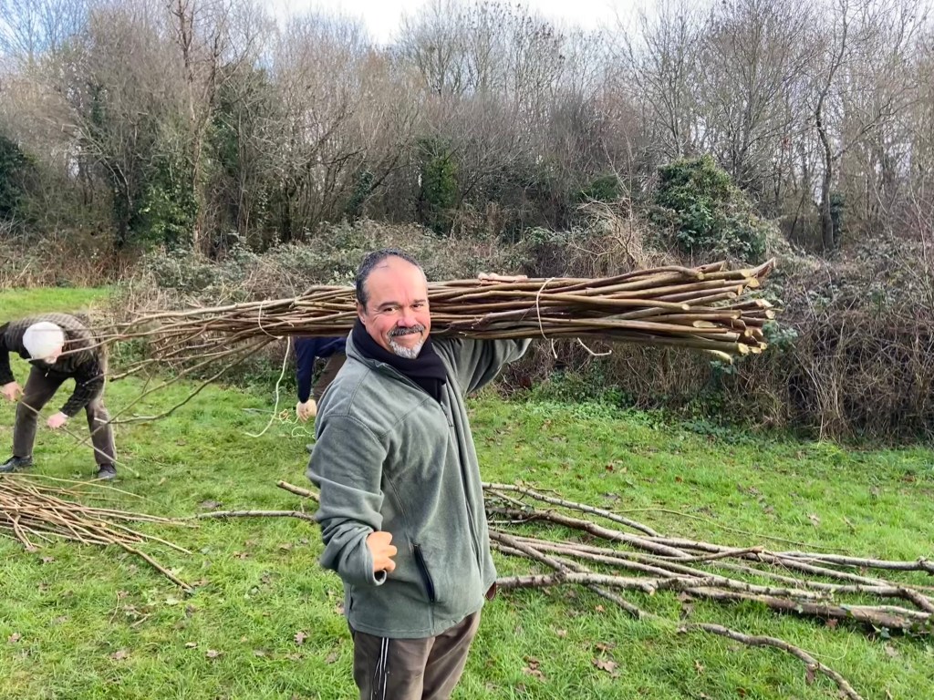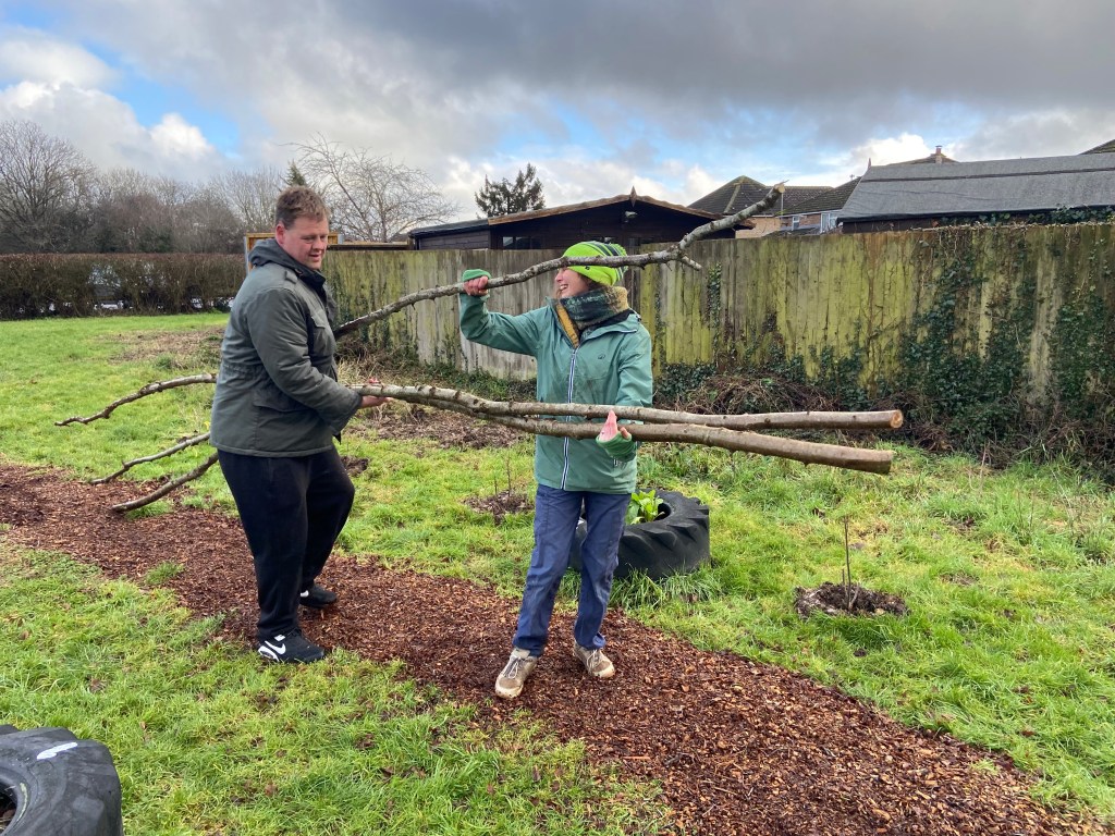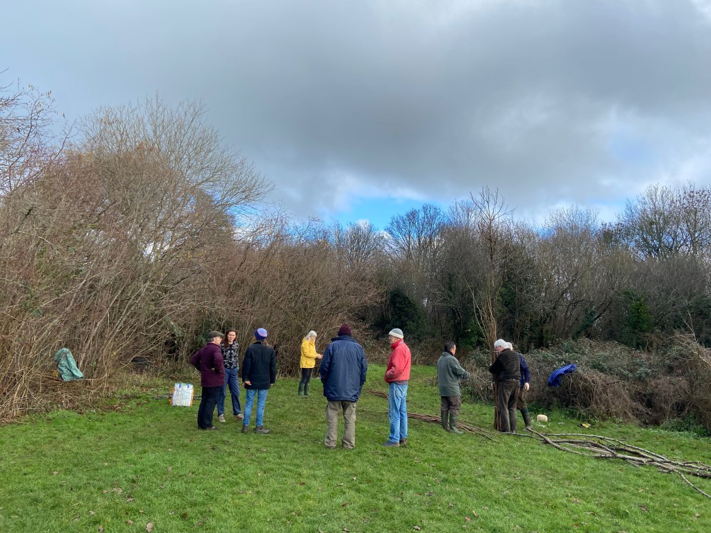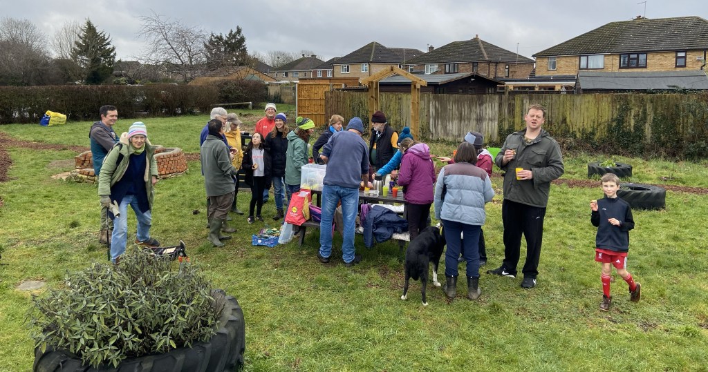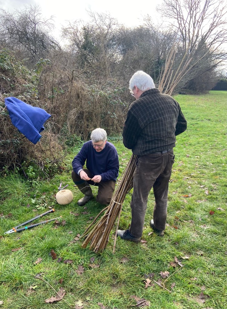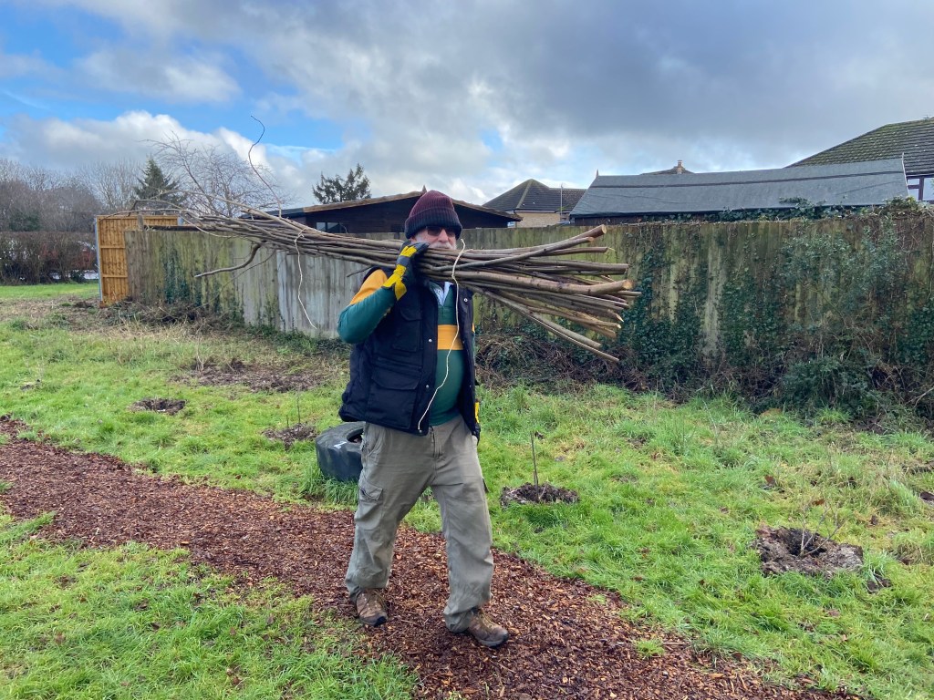 Park Hill Growing Space and St Mary’s Fields Kidlington volunteers combined forces with Kidlington Parish Council last Saturday to woodchip paths, plant sweet peas, mulch fruit bushes and hedgerows, and coppice the hazel in the Park Hill copse, and did so with trademark camaraderie, mirth, gusto and cake. The plan is for the ‘stakes and binders’ harvested during the coppicing to be made into hurdles for Axtell Close.