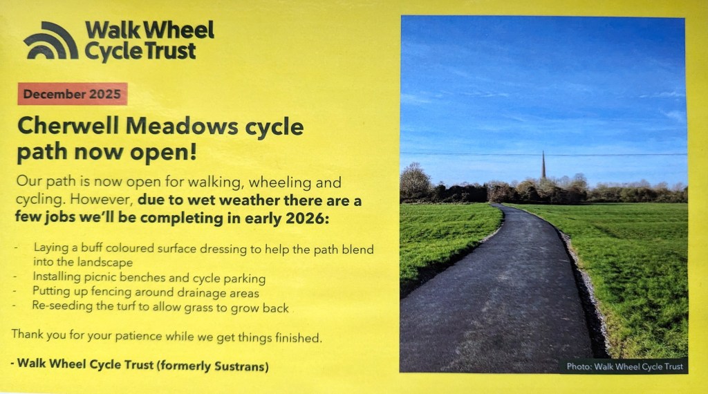 The Walk Wheel Cycle Trust (formerly known as Sustrans) has also laboured hard to resurface the Route 51 cycle path over the ridge and furrow fields and the first phase of this is now complete (though currently under the water that is usual this time of year!). More work is still to be done, and features to be added later in 2026.